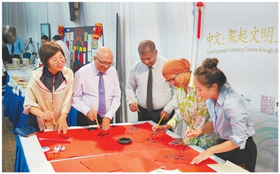 在马尔代夫维拉学院汉语中心举行的文化体验活动上,与会嘉宾共同书写“福”字。