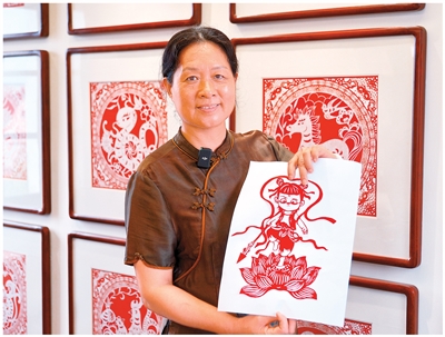 刘莲花在展示她的剪纸作品。本报记者 赵 昊摄