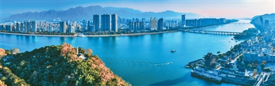 在桐庐县非遗馆陈列的5米剪纸长卷《新富春山居图》,是由桐庐剪纸名家王德林主创构图、刘莲花共同执刀刻制的。这幅作品以沿江的城镇和景点为珠,用山峦水波为线,将其串联成篇,阴刻与阳刻交织,如山水般刚柔相济。