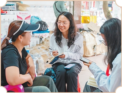 人民日报记者采访在那坡经营水果生意的越南商户(左一)。