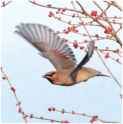 颐和园西堤,小太平鸟从金银木枝头飞过。胡 葳摄