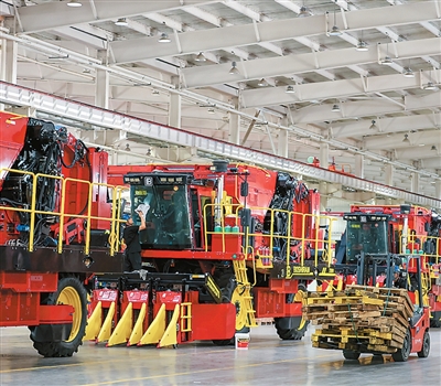 眼下正是采棉机生产旺季,新疆生产的四行箱式采棉机将通过霍尔果斯口岸中转运往土耳其、乌兹别克斯坦等国。图为工人在新疆钵施然智能农机股份有限公司的采棉机生产车间驾驶叉车运送配件。新华社记者 王 菲摄