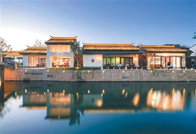 游客在上海市青浦区蟠龙天地街区水岸边休息。蟠龙古镇曾是城中村,改造后成为商业街区。