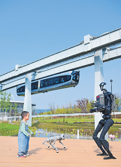 湖北省武汉市东湖高新区空轨高新大道站附近,装上“智慧大脑”的人形机器人与小朋友一起跳舞。近年来,东湖高新区通过推动科技创新和产业创新融合发展、引进拔尖科技人才等方式,构建高水平创新创业生态。