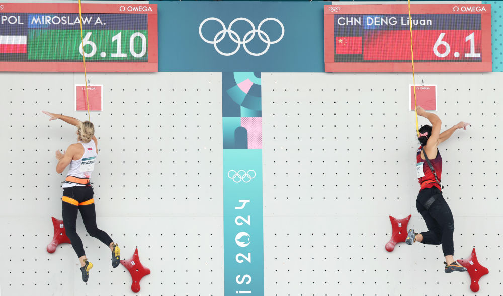 图为2024年8月7日进行的巴黎奥运会攀岩女子速度赛决赛画面。新华社记者 高静 摄