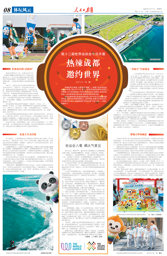 人民日报海外版电 热辣的四川成都,今夏再次“沸腾”,一场属于全世界的运动派对即将上演。8月7日,第十二届世界运动会将在这里拉开帷幕。作为全球最高水平的非奥项目综合性赛事,世运会将带来一系列极具看头的比赛,解锁体育的无限可能。