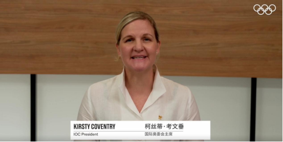 图为国际奥委会主席考文垂发来视频致辞(图片来源:新华社)