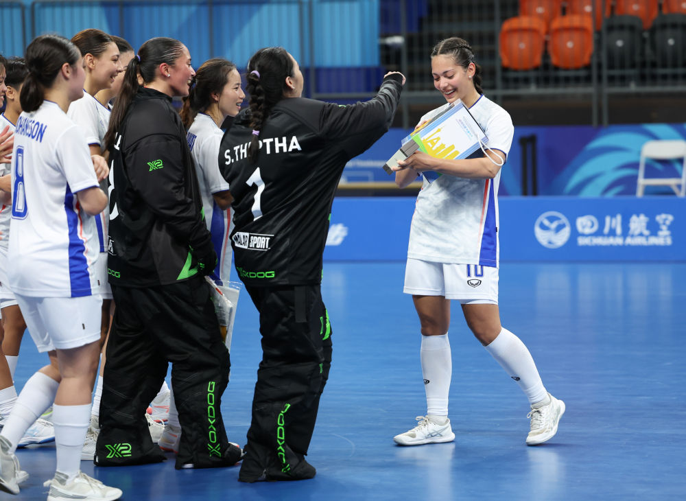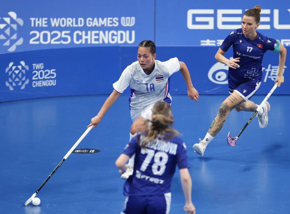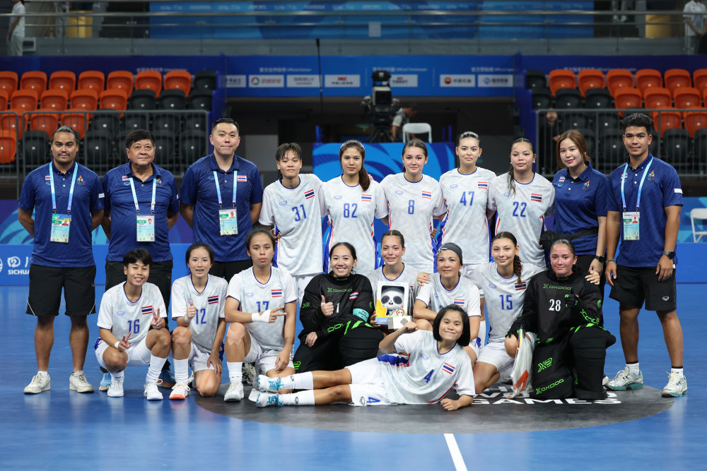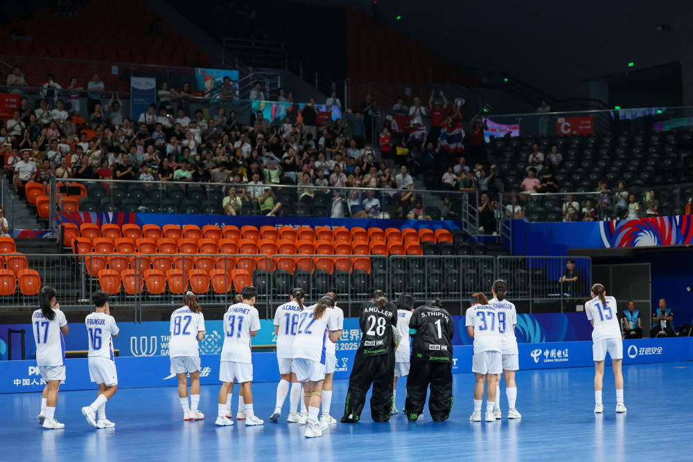 ↑泰国队成员在成都世运会软式曲棍球女子A组预赛后合影。