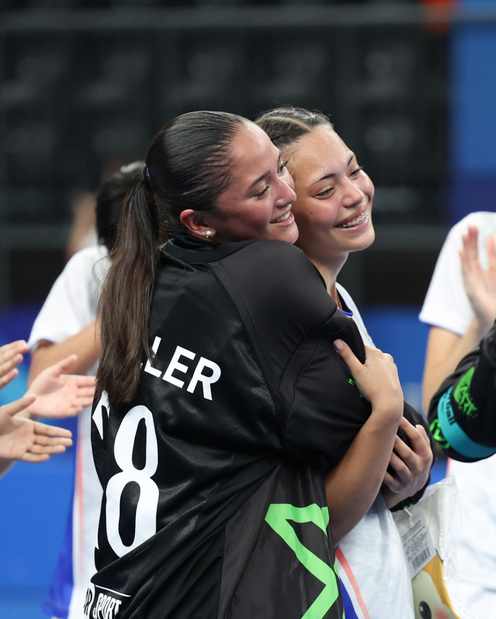 ↑泰国队球员卡尔布姆(右)在赛后接受祝福。
