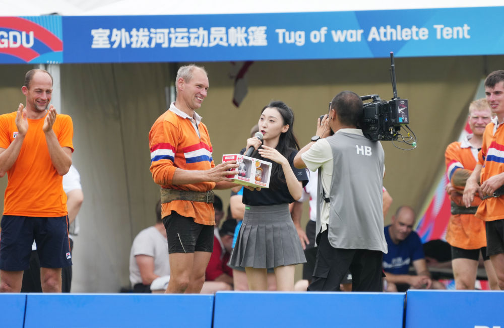 ↑现场主持人给荷兰队选手文森特·瓦根曼斯送上生日礼物。