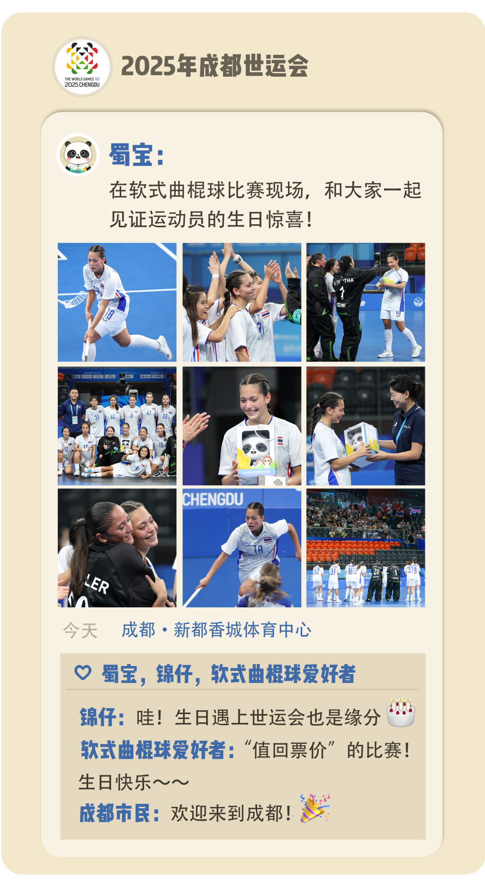 手里捧着生日礼物吉祥物“蜀宝”和“羽人胸针”