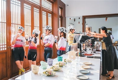 安徽省芜湖市繁昌区峨山镇东岛村的一家“村咖”内,骑行爱好者在此休憩品鉴咖啡。肖本祥摄(人民图片)