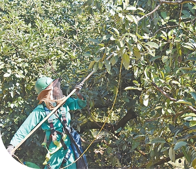 在威斯特伐利亚公司位于察嫩的牛油果园,身穿绿色制服的工人正用网兜将牛油果摘下,装到斜挎在身上的背包里。背包装满后,工人们将牛油果装到运输车上。随后,这些牛油果被运送到牛油果包装厂,进行检测、清洗、分拣、包装等程序。