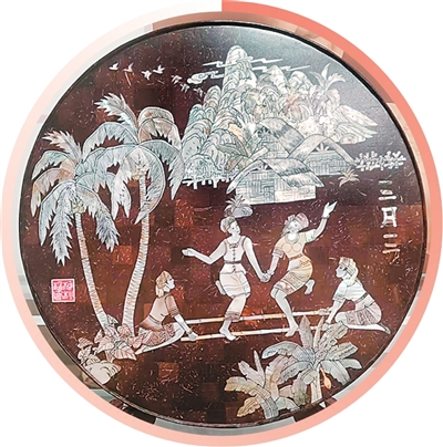海南椰雕与螺钿工艺结合的黎族“三月三”主题摆件。均由受访者供图