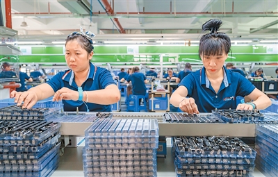 湖南省永州市冷水滩区持续优化营商环境,支持引导民营企业通过技术改造与数字化转型实现提质升级,推动民营经济高质量发展。图为该区一电子科技公司生产车间内,工人在生产线上赶制订单产品。雷中祥摄(人民视觉)