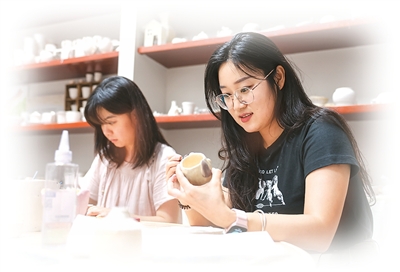 7月15日,在湖北省襄阳市襄城区青年人才夜校管家巷教学点一家陶艺馆,学员在绘制彩陶。杨东摄(人民图片)