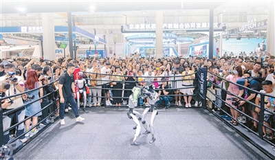 “那个机器人出拳好快呀!”“小黑加油!”“这一记勾拳真漂亮!”……在宇树科技展区,一场机器人格斗赛正在进行,两款G1格斗款人形机器人分别佩戴黑色和浅绿色护具,在闪转腾挪间拳脚相接,发出清脆的金属碰撞声,引来现场观众频频喝彩。