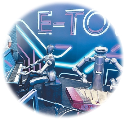 进入餐厅主就餐区,由5个机器人乐手组成的机器人乐队正在演奏乐曲。5个机器人各司其职,弹琴、打鼓、弹贝斯等样样精通,并不时随着摇滚乐曲扭动“机械躯体”,为顾客带来极具感染力的视听体验。