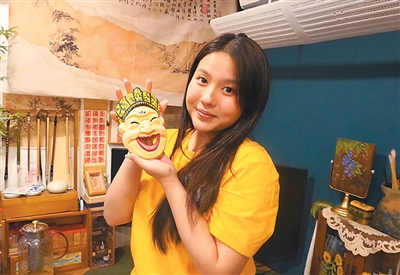 我平时喜欢在平板电脑上画画,所以对一切绘画体验项目都跃跃欲试。选面具时,一眼就看中了一个带微笑的新式面具。我先给它涂上肤色,嘴唇和腮红用了红色。帽子用了我喜欢的黄蓝两色,并加入青花瓷纹样。之前我接触过一些中国传统艺术,总想着把那些元素用进来,于是我在面具的额头上画了朵小花钿,这样显得不单调了。听到工作坊的工作人员夸我是“灵魂画手”,我心里美滋滋的。这次体验不仅让我体会到做手工的乐趣,更让我从艺术和仪式的角度深入认识了中国传统文化。