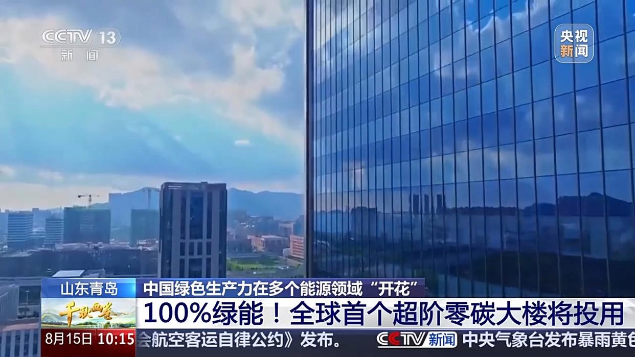 大楼玻璃幕墙东西南三面安装了光伏玻璃,可以输送绿电。除了光伏发电外,大楼还通过梯次储能电池和新能源电车放电,实现100%绿能替代。