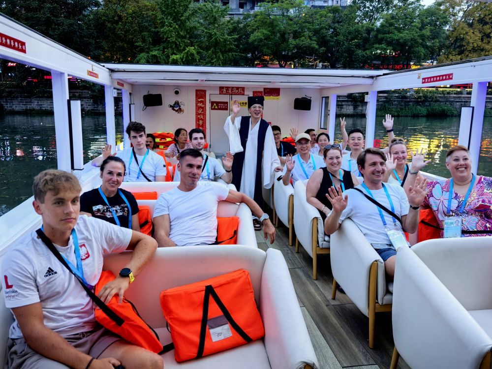 8月6日,前来参加成都世运会的运动员和教练乘游船游览锦江。新华社发(杨苛摄)