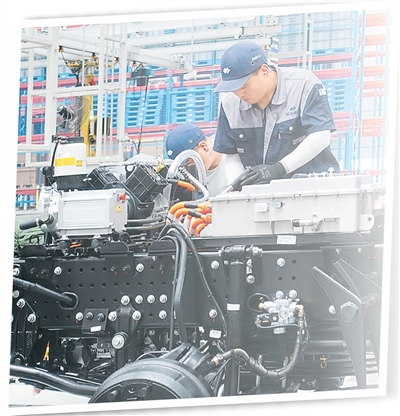 在山东省临沂市雷驰新能源汽车有限公司生产车间,工人们在组装新能源重型卡车。