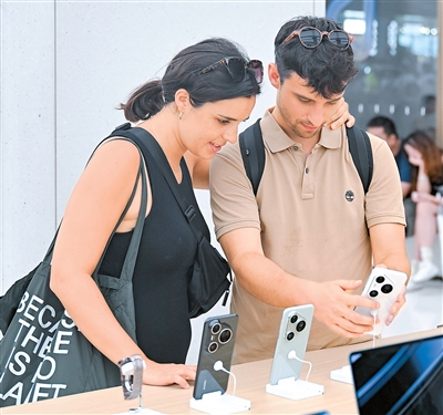 今年上半年,上海海关共验核离境退税申请单6.4万票,比去年同期大幅增长1.4倍。图为7月17日,两名西班牙游客在位于上海市南京路步行街的华为商店里浏览手机产品。