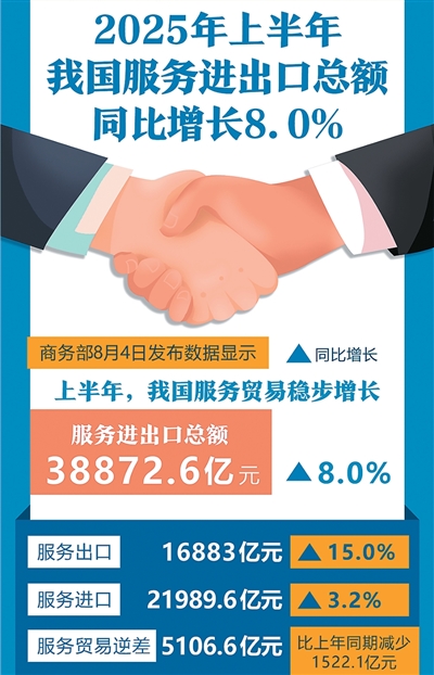 服务进出口总额38872.6亿元,同比增长8%;旅行服务出口同比大幅增长68.7%;知识密集型服务贸易增势明显;贸易逆差进一步缩小……近日,中国服务贸易上半年数据出炉,呈现诸多亮点。