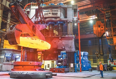 近年来,河南省洛阳市积极支持引导当地矿山装备、节能环保装备等制造业龙头企业提升产业链自主化水平,推动制造业高端化、智能化、绿色化转型。图为位于洛阳市涧西区的中信重工锻压车间内,工人正在锻压一批直径超6米的超大型高端铸锻件产品。