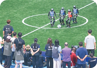 八月十七日,人形机器人在世界人形机器人运动会足球决赛中比拼。陈晓根摄(人民图片)