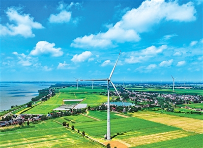 江西省九江市彭泽县棉船镇,十余台风力发电机迎风旋转,与村庄、农田相映成趣,构成一幅风光旖旎、绿意盎然的江景画卷。朱海鹏摄(人民视觉)
