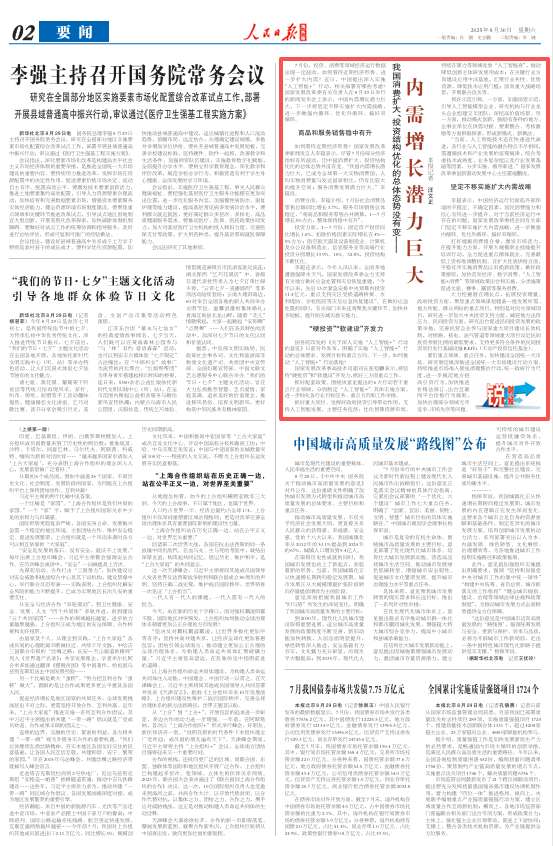7月份,投资、消费等领域经济运行数据出现一定波动,如何看待近期经济形势、进一步扩大内需?近日,中国提出深入实施“人工智能+”行动,相关部署有哪些考虑?国家发展改革委有关负责人在8月29日举行的新闻发布会上表示,中国内需增长潜力巨大,下一步将坚定不移实施扩大内需战略,进一步做强内循环、优化外循环、搞好双循环。
