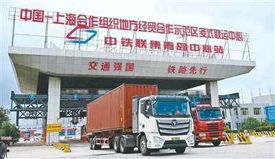 运送集装箱的货车从上合示范区多式联运中心中铁联集青岛中心站驶出。