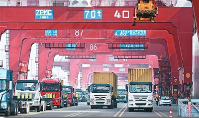山东省青岛市上合示范区与青岛港互联互通,打造了“前港后站、一体运作”海铁联运服务模式。图为货车在山东港口青岛港运送集装箱。