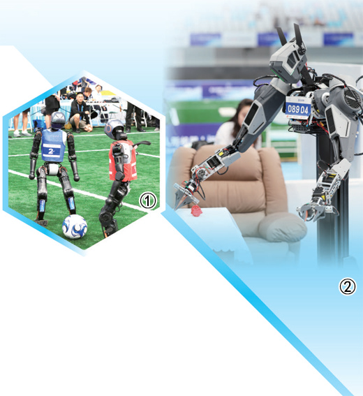 图①:机器人选手在踢足球。