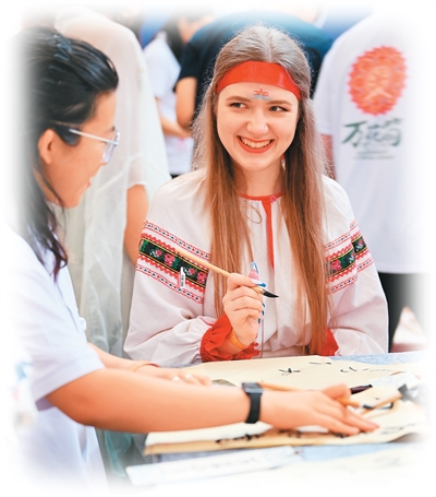 8月6日,“上合之约·丝路津彩”上合国家青年学生“万花筒”文化市集在天津举行。图为青年学生体验书法。新华社记者 李 然摄