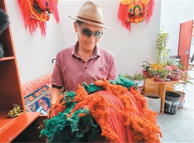 邓巴阿尼展示第一代舞狮服装。本报记者 吕九海摄