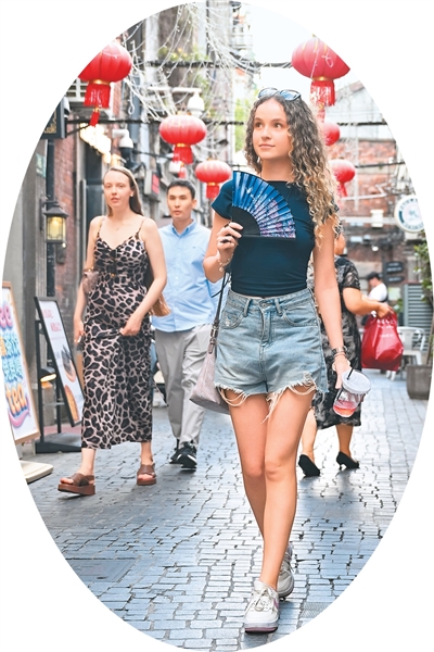 俄罗斯游客索尼娅·布里亚克(右)行走在上海市田子坊。新华社记者 陈浩明摄