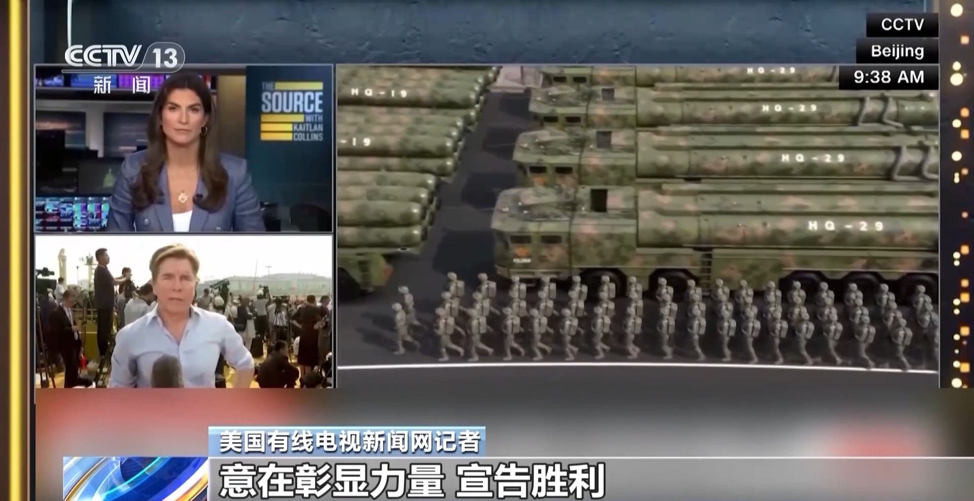 美国有线电视新闻网主持人:今晚此刻,我们正在关注北京这场盛大阅兵的现场直播画面 。