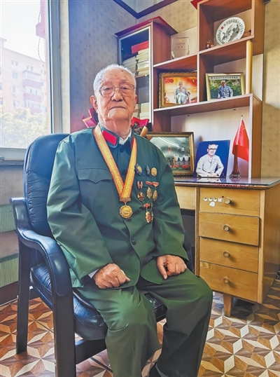 9月7日,北京某干休所。阳光透过书房的窗户,洒在抗战老兵张坪(见图,人民日报记者潘俊强摄)身上,军装上的荣誉勋章熠熠生辉。墙上、桌台上是张坪不同时期的纪念照片,串联起百岁老人的革命生涯。