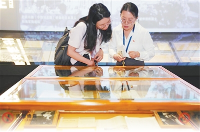 6月6日,上海市档案馆工作人员(右)向参观者讲解“得道多助——国际友人与中国抗战”主题珍档。